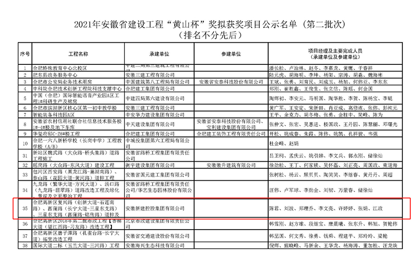 11月17日,安徽省住房和城鄉(xiāng)建設(shè)廳發(fā)布2021年安徽省建設(shè)工程"黃山杯"獲獎(jiǎng)項(xiàng)目名單。安徽新建控股集團(tuán)承建的合肥高新區(qū)復(fù)興路(創(chuàng)新大道——石蓮南路)、菖蒲路(長寧大道——三星東支路)、三星東支路(菖蒲路——銘傳路)道排及附屬工程項(xiàng)目榜上有名。