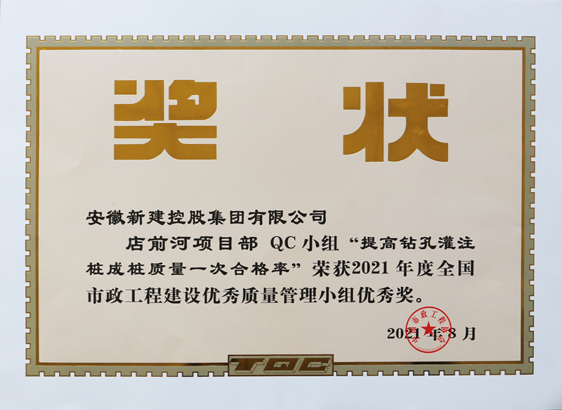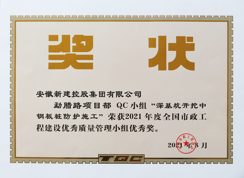 近日,中國(guó)市政工程協(xié)會(huì)頒發(fā)了2021年度全國(guó)市政工程建設(shè)優(yōu)秀質(zhì)量管理小組獲獎(jiǎng)證書,安徽新建控股集團(tuán)2項(xiàng)QC小組成果“深基坑開(kāi)挖中鋼板樁防護(hù)施工”、“提高鉆孔灌注樁成樁質(zhì)量一次合格率”榮獲優(yōu)秀獎(jiǎng),工程質(zhì)量管理繼續(xù)向前邁步。