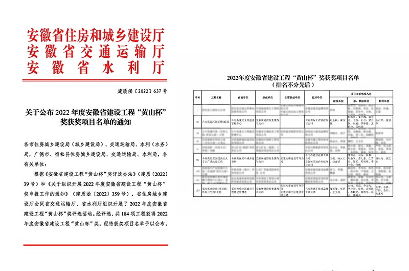 “黃山杯”獎為安徽省建設(shè)工程質(zhì)量的最高獎,由省住房城鄉(xiāng)建設(shè)廳、省交通運輸廳、省水利廳聯(lián)合頒發(fā),每年評選一次,在提高全省工程質(zhì)量水平上發(fā)揮示范引領(lǐng)作用。公司在承建項目之初,就將“精品工程”作為工程目標(biāo)進行實施,并積極創(chuàng)優(yōu),從策劃、實施、總結(jié)提煉全過程進行控制,并提出了按質(zhì)按量完成各項施工任務(wù)。施工過程中,項目部按照制定的施工組織方案,對各項工序嚴(yán)格把關(guān),各項技術(shù)指標(biāo)進行嚴(yán)格控制,保證了施工質(zhì)量。