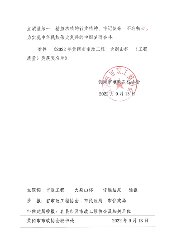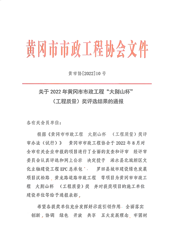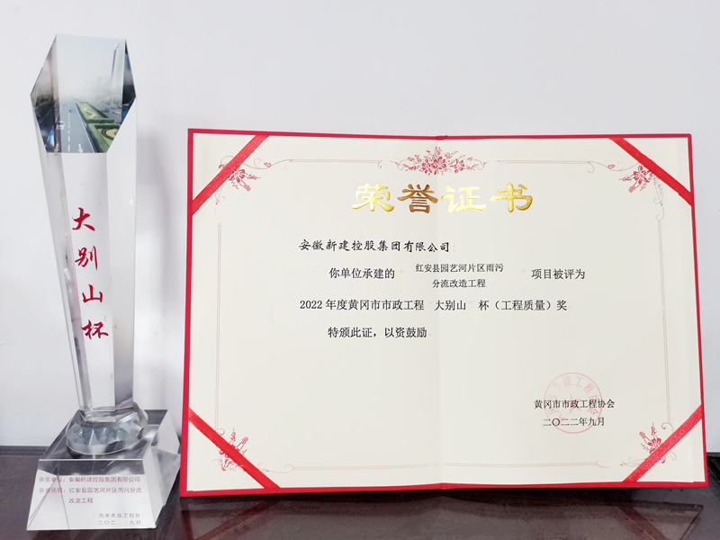 近日,黃岡市市政工程協(xié)會發(fā)布2022年度黃岡市市政工程(大別山杯)表彰名單,集團(tuán)公司承建的紅安縣園藝河片區(qū)雨污分流改造工程被評為2022年度黃岡市市政工程大別山杯(工程質(zhì)量獎)。