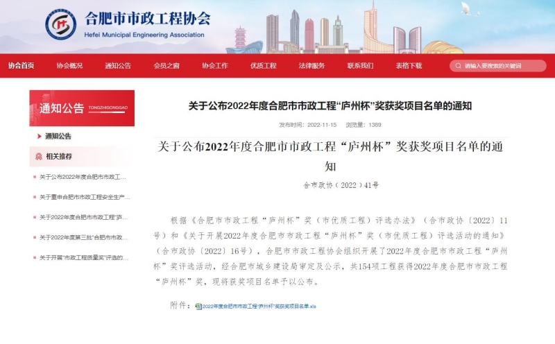 11月15日,合肥市市政工程協(xié)會網(wǎng)站發(fā)布《關(guān)于公布2022年度合肥市市政工程“廬州杯”獎獲獎項目名單的通知》,安徽新建承建三項市政工程喜獲2022年度合肥市市政工程“廬州杯”獎。
