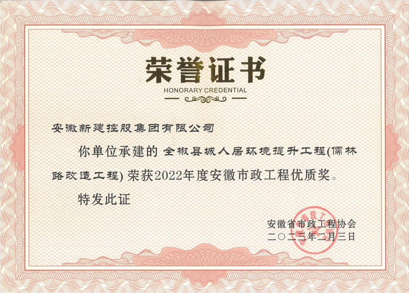 日前,安徽省市政工程協(xié)會(huì)頒發(fā)了2022年度安徽市政工程優(yōu)質(zhì)獎(jiǎng)獲獎(jiǎng)項(xiàng)目榮譽(yù)證書(shū),集團(tuán)公司承建的廬江縣左慈路青蓮路工程、全椒縣城人居環(huán)境提升工程兩項(xiàng)項(xiàng)目均獲市政工程優(yōu)質(zhì)獎(jiǎng)。