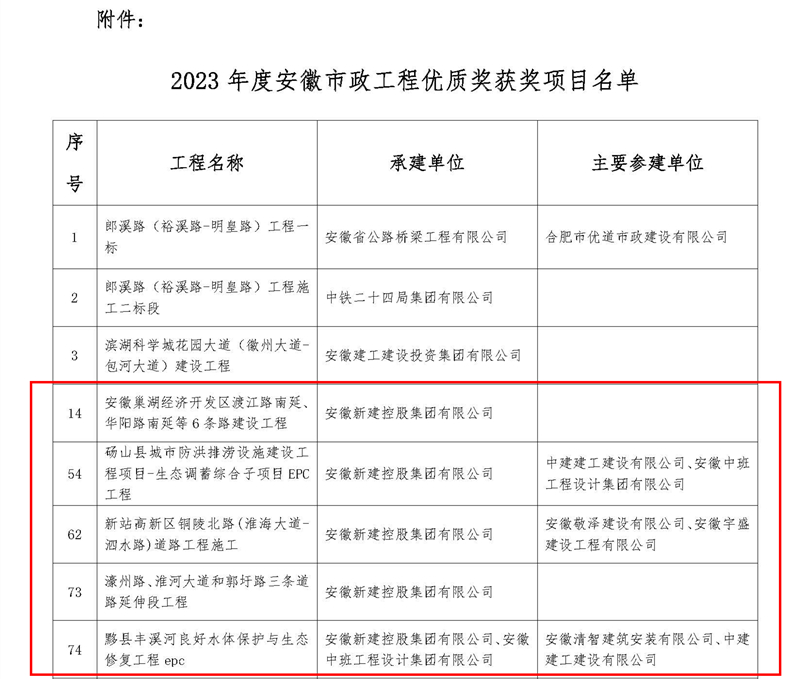 1月31日,安徽省市政工程協(xié)會公布關(guān)于“2023年度安徽省市政工程優(yōu)質(zhì)獎”評選結(jié)果的通知,集團公司承建的安徽巢湖經(jīng)濟開發(fā)區(qū)渡江路南延、華陽路南延等6條路建設(shè)工程、碭山縣城市防洪排澇設(shè)施建設(shè)工程項目-生態(tài)調(diào)蓄綜合子項目EPC工程、新站高新區(qū)銅陵北路(淮海大道泗水路)道路工程施工、濠州路、淮河大道和郭圩路三條道路延伸段工程、黟縣豐溪河良好水體保護與生態(tài)修復(fù)工程epc等5項工程榮獲2023年度安徽省市政工程優(yōu)質(zhì)獎獎項。