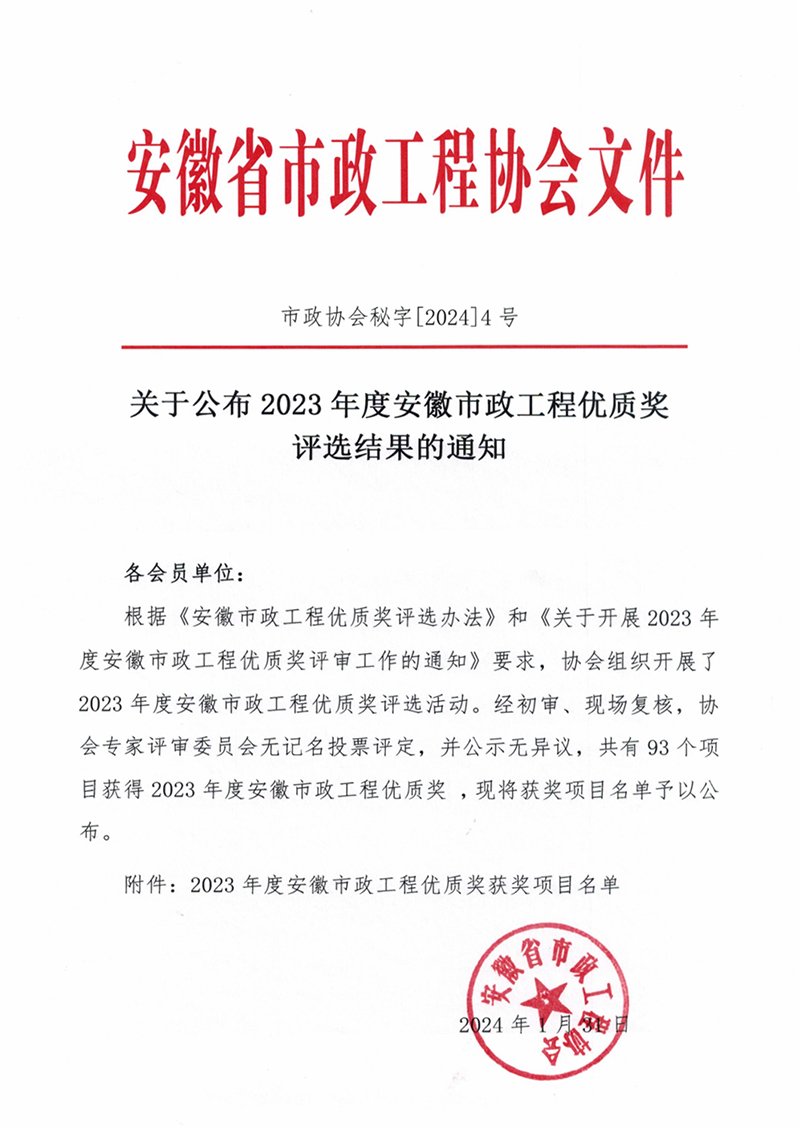 安徽省“市政工程優(yōu)質(zhì)獎” 是安徽省市政工程質(zhì)量的最高榮譽獎項,每年評選一次,評審標(biāo)準(zhǔn)執(zhí)行國家建設(shè)標(biāo)準(zhǔn)強制性條文和現(xiàn)行規(guī)范、標(biāo)準(zhǔn)及設(shè)計要求,并結(jié)合安徽省工程質(zhì)量標(biāo)準(zhǔn)和實際工程質(zhì)量水平,是市政工程技術(shù)及工藝水平先進性和可行性最好的體現(xiàn)。公司一直嚴格加強工程質(zhì)量管理,在項目施工過程中,建立質(zhì)量責(zé)任制、材料設(shè)備進場驗收制度、材料設(shè)備進場驗收制度、樣板引路、施工掛牌制度、質(zhì)量否決制度、成品保護制度、隱蔽工程驗收制度、質(zhì)量問題整改制度,對項目質(zhì)量實行全過程管控。