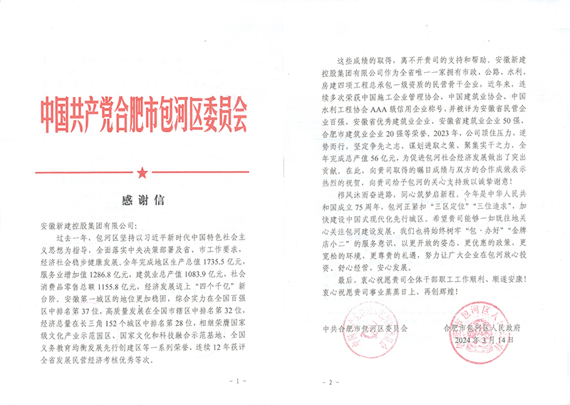信中指出,過(guò)去一年,包河區(qū)建筑業(yè)總產(chǎn)值1083.9億元,經(jīng)濟(jì)發(fā)展邁上“四個(gè)千億”新臺(tái)階。成績(jī)?nèi)〉?,離不開集團(tuán)公司的支持和幫助。安徽新建控股集團(tuán)有限公司作為全省唯-一家擁有市政、公路、水利、房建四項(xiàng)工程總承包一級(jí)資質(zhì)的民營(yíng)骨干企業(yè),近年來(lái),連續(xù)多次榮獲中國(guó)施工企業(yè)管理協(xié)會(huì)、中國(guó)建筑業(yè)協(xié)會(huì)、中國(guó)水利工程協(xié)會(huì)AAA級(jí)信用企業(yè)稱號(hào),并被評(píng)為安徽省民營(yíng)企業(yè)百?gòu)?qiáng)、安徽省優(yōu)秀建筑業(yè)企業(yè)、安徽省建筑業(yè)企業(yè)50強(qiáng)合肥市建筑業(yè)企業(yè)20強(qiáng)等榮譽(yù)。2023年,公司頂住壓力,逆勢(shì)而行,堅(jiān)定爭(zhēng)先之志、謀劃進(jìn)取之策、聚集實(shí)干之力,全年完成總產(chǎn)值56億元,為促進(jìn)包河社會(huì)經(jīng)濟(jì)發(fā)展做出了突出貢獻(xiàn)。