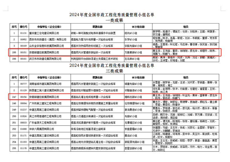 近日,中國市政工程協(xié)會公布了2024年度全國市政工程優(yōu)秀質(zhì)量管理小組名單,集團公司萬象更新QC小組申報的《提高雨污水管道安裝驗收一次合格率》榮獲一類成果;推陳出新QC小組申報的《提高鉆孔灌注樁成樁質(zhì)量一次合格率》榮獲三類成果。