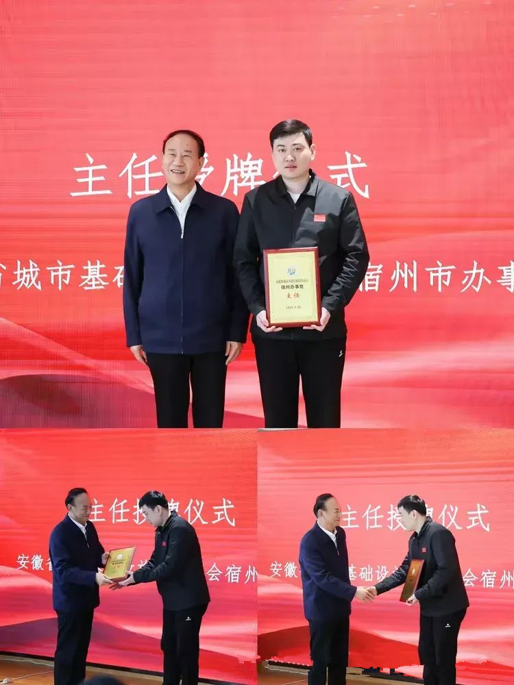 安徽省城市基礎(chǔ)設(shè)施投資商會(huì)會(huì)長(zhǎng)、安徽新建控股集團(tuán)有限公司董事長(zhǎng)王杰英向新任宿州市辦事處主任臧宇授牌。