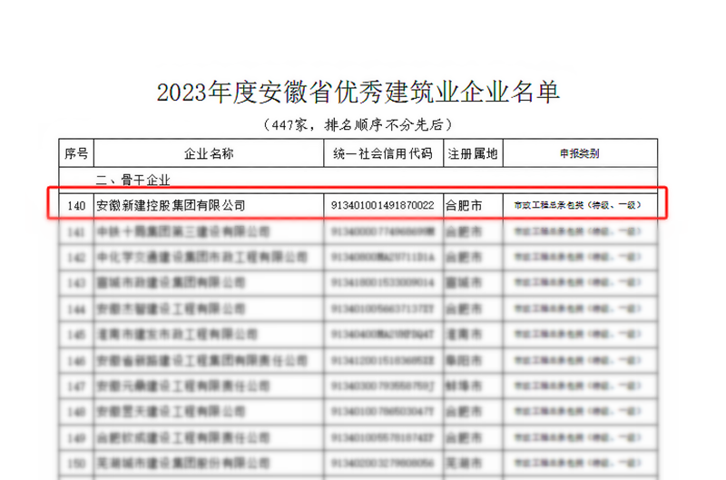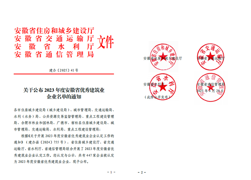 近日,安徽省住房和城鄉(xiāng)建設廳、省交通運輸廳、省水利廳、省通信管理局聯(lián)合公布"2023年度安徽省優(yōu)秀建筑業(yè)企業(yè)"名單。集團公司憑借非凡實力,被認定為“安徽省建筑業(yè)骨干企業(yè)”,并連續(xù)四年榮獲“安徽省優(yōu)秀建筑業(yè)企業(yè)”稱號!