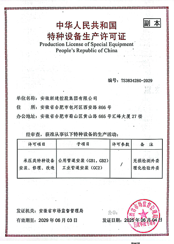 取得《特種設(shè)備生產(chǎn)許可證》,不僅是公司技術(shù)實(shí)力和市場(chǎng)信譽(yù)的高度認(rèn)可,更為公司承接高規(guī)格、高標(biāo)準(zhǔn)的特種設(shè)備生產(chǎn)項(xiàng)目提供了堅(jiān)實(shí)的保障,助力集團(tuán)公司進(jìn)一步拓展市場(chǎng),增強(qiáng)營(yíng)銷實(shí)力,提升核心競(jìng)爭(zhēng)力,推動(dòng)企業(yè)實(shí)現(xiàn)高質(zhì)量發(fā)展。