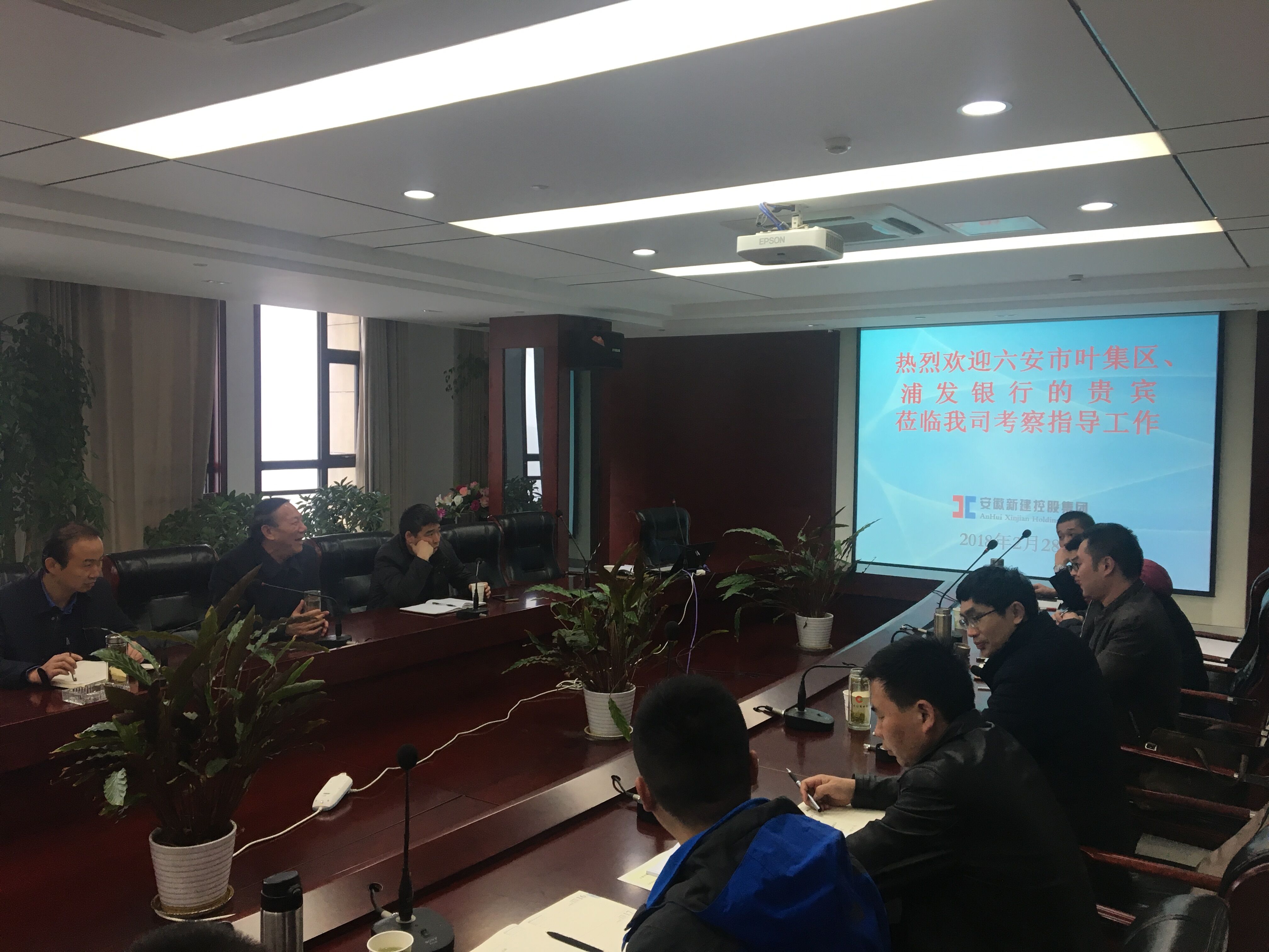 2018年8月28日上午,六安市葉集區(qū)財政局副局長、浦發(fā)銀行蕪湖分行熊赟副行長、六安市葉集建設(shè)投資經(jīng)營有限責任公司王磊董事長等一行來我公司洽談工程項目融資事宜,安徽新建控股集團有限公司王杰英董事長及相關(guān)領(lǐng)導熱情接待。