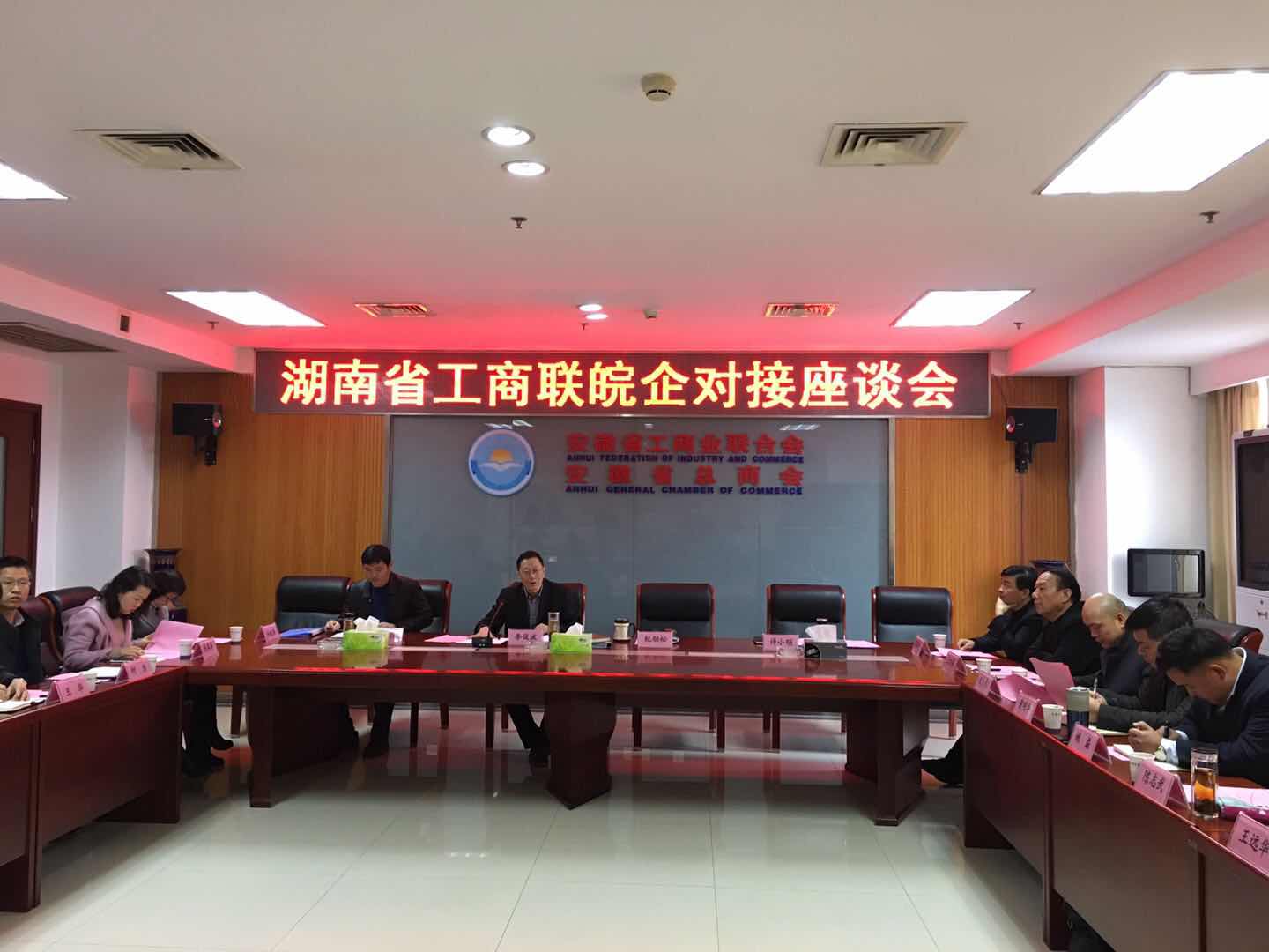 2018年3月19日上午,安徽省工商聯(lián)在十八樓會議室舉辦“湖南省工商聯(lián)皖企對接座談會”,安徽省工商聯(lián)黨組成員、副主席兼秘書長李俊波主持會議,安徽省工商聯(lián)副巡視員紀(jì)勁松、安徽省工商聯(lián)會員處副處長李祖旺、安徽省工商聯(lián)經(jīng)濟處主任科員許小明、湖南省工商聯(lián)副巡視員甘露一行及十多位企業(yè)家代表參加了座談會,安徽新建控股集團有限公司董事長應(yīng)邀參加座談會。