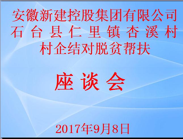2017年9月8日,我公司村企結(jié)對(duì)脫貧幫扶對(duì)象石臺(tái)縣仁里鎮(zhèn)杏溪村的村委書(shū)記雷霆一行來(lái)我公司座談,安徽新建控股集團(tuán)有限公司董事長(zhǎng)王杰英等相關(guān)領(lǐng)導(dǎo)參加了座談會(huì),雷書(shū)記對(duì)杏溪村的脫貧情況進(jìn)行了詳細(xì)介紹,公司領(lǐng)導(dǎo)對(duì)杏溪村脫貧幫扶給出了初步計(jì)劃和方案,村企雙方對(duì)座談效果感到滿(mǎn)意。