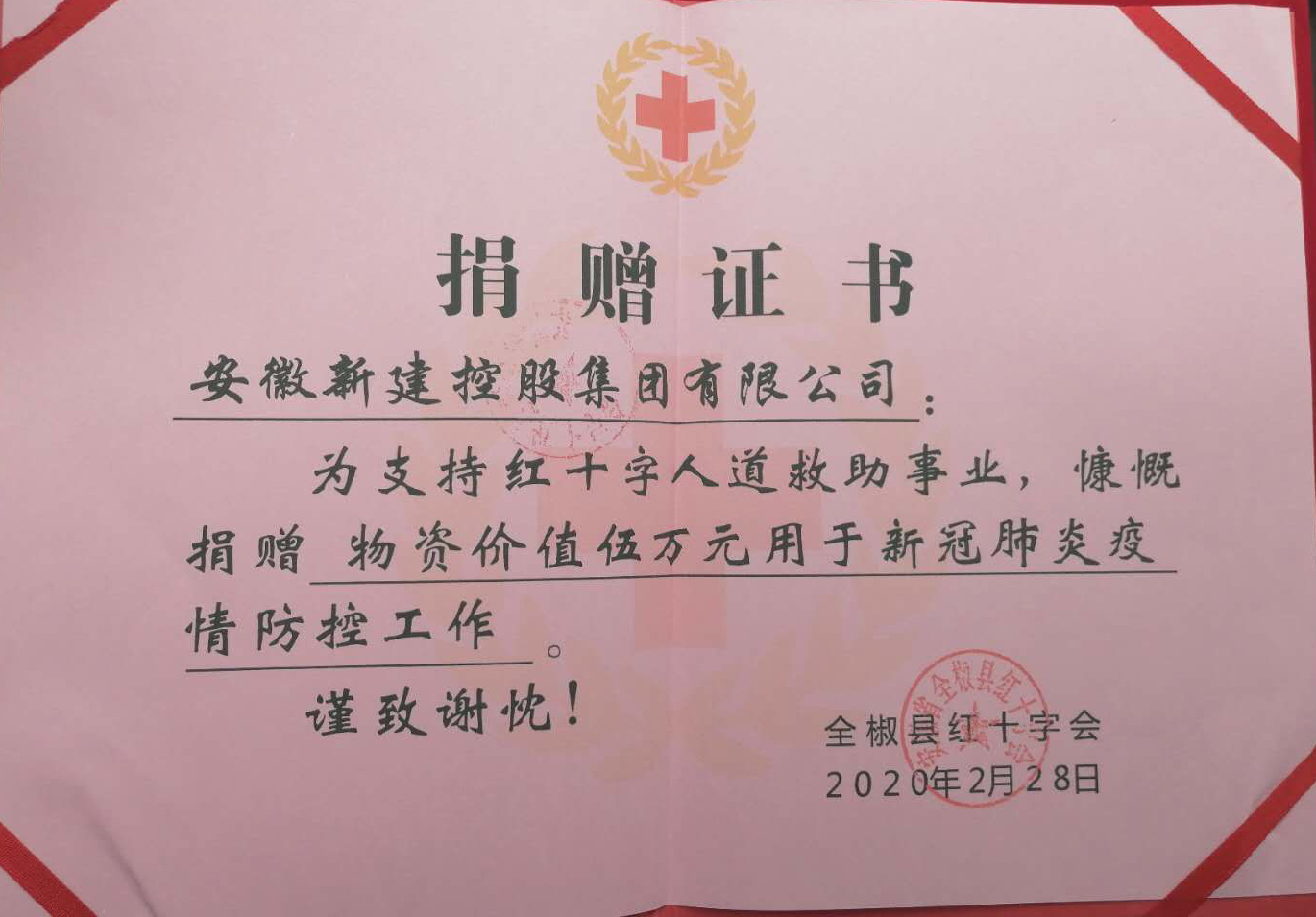 繼2月3日我公司通過安徽省工商聯(lián)向疫區(qū)捐款5萬元后,2月28日,安徽新建控股集團(tuán)有限公司再次以實(shí)際行動(dòng)支持抗役,又向滁州市全椒縣紅十字會(huì)捐贈(zèng)350箱方便面、250箱酸奶、200箱餅干共價(jià)值5萬元的物資。