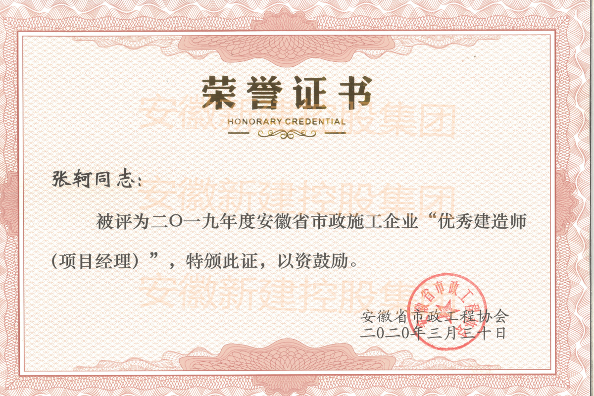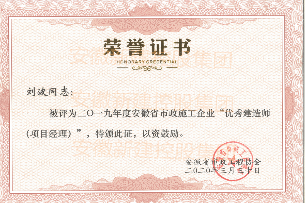 近日,經(jīng)安徽省市政工程協(xié)會組織評審,集團公司副總經(jīng)理劉波、工程管理部張珂、省外市場部唐海運三人,被評為2019年度安徽省市政施工企業(yè)“優(yōu)秀建造師(項目經(jīng)理)”。