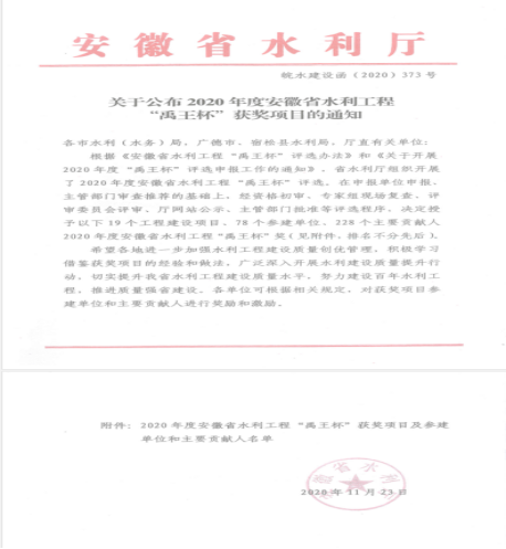 近日,根據(jù)《安徽省水利工程“禹王杯”評(píng)選辦法》和《關(guān)于開(kāi)展2020年度“禹王杯”評(píng)選申報(bào)工作的通知》,在省水利廳組織開(kāi)展的評(píng)選活動(dòng)中,經(jīng)資格初審、專(zhuān)家組現(xiàn)場(chǎng)復(fù)查、評(píng)審委員會(huì)評(píng)審、公示,主管部門(mén)批準(zhǔn)等程序,由安徽新建控股集團(tuán)有限公司施工的“黃山風(fēng)景區(qū)麻川河丹井口至洗藥橋段防洪治理工程施工2標(biāo)”工程脫穎而出,被安徽省水利廳綜合評(píng)定為“2020年度安徽省水利工程‘禹王杯’獎(jiǎng)”!