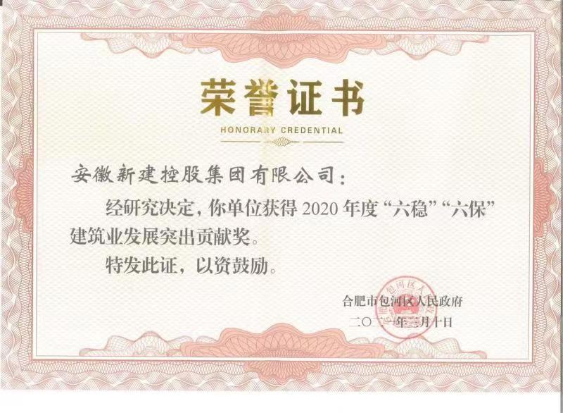 熱烈祝賀安徽新建控股集團(tuán)有限公司榮獲2020年度“六穩(wěn)”“六保”建筑業(yè)發(fā)展突出貢獻(xiàn)獎!