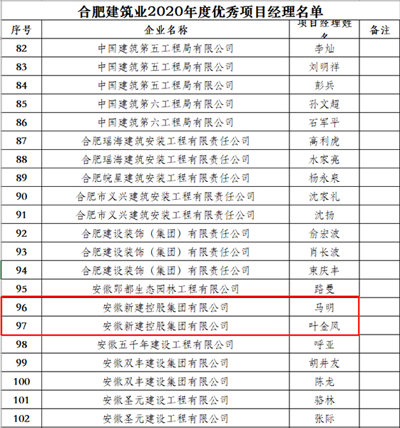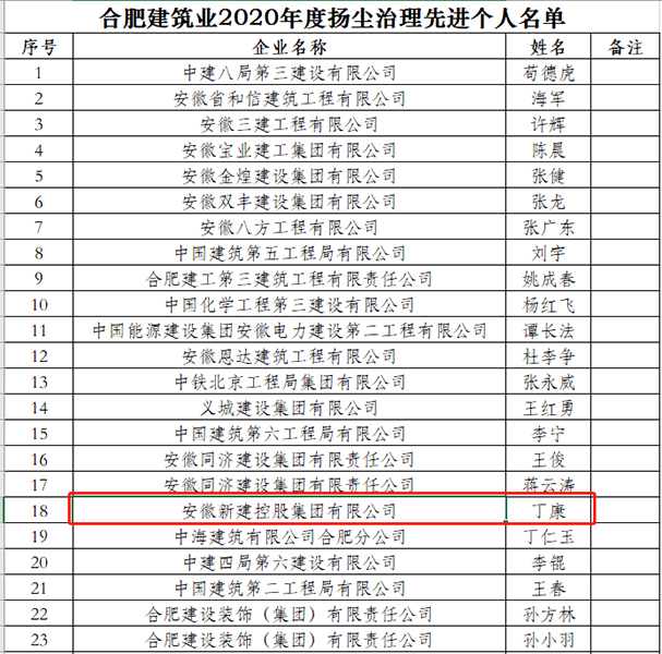近日,合肥市建筑工程協(xié)會發(fā)布通知,合肥建筑業(yè)2020年度評優(yōu)評先工作已全面完成,獲獎單位頒發(fā)領(lǐng)取榮譽證書。安徽新建控股集團公司榮獲合肥建筑業(yè)2020年度質(zhì)量管理先進企業(yè)、合肥建筑業(yè)2020年度優(yōu)秀施工企業(yè)等2項榮譽。同時,集團公司馬明、葉金鳳也被授予合肥建筑業(yè)2020年度優(yōu)秀項目經(jīng)理,丁康被授予合肥建筑業(yè)2020年度揚塵治理先進個人。