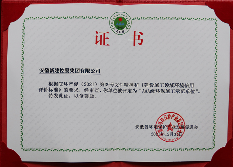 近日,經(jīng)安徽省環(huán)境保護(hù)產(chǎn)業(yè)發(fā)展促進(jìn)會綜合評定并向社會公示,安徽新建控股集團(tuán)順利通過綜合評審,榮獲“AAA級環(huán)保施工示范單位”。