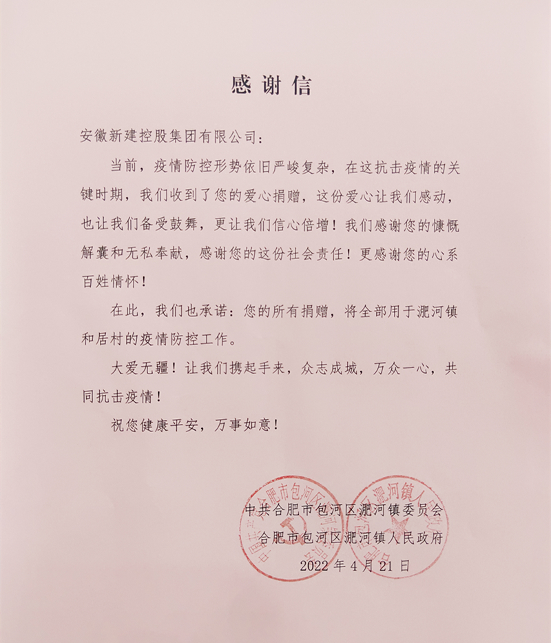 活動結束后,淝河鎮(zhèn)黨委、淝河鎮(zhèn)人民政府向集團公司發(fā)來感謝信。感謝信內(nèi)容如下: