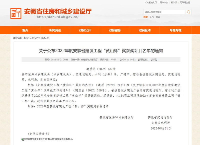 “黃山杯”獎為安徽省建設(shè)工程質(zhì)量的最高獎,由省住房城鄉(xiāng)建設(shè)廳、省交通運輸廳、省水利廳聯(lián)合頒發(fā),每年評選一次,在提高全省工程質(zhì)量水平上發(fā)揮示范引領(lǐng)作用。公司在承建項目之初,就將“精品工程”作為工程目標(biāo)進行實施,并積極創(chuàng)優(yōu),從策劃、實施、總結(jié)提煉全過程進行控制,并提出了按質(zhì)按量完成各項施工任務(wù)。施工過程中,項目部按照制定的施工組織方案,對各項工序嚴(yán)格把關(guān),各項技術(shù)指標(biāo)進行嚴(yán)格控制,保證了施工質(zhì)量。