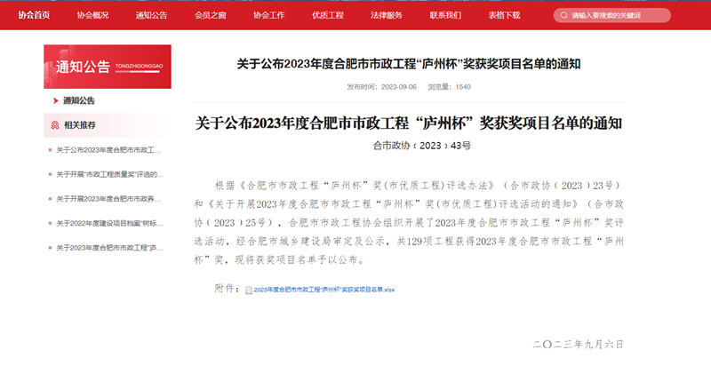 9月6日,合肥市市政工程協(xié)會(huì)官網(wǎng)發(fā)布了《關(guān)于公布2023年度合肥市政工程“廬州杯”獎(jiǎng)獲獎(jiǎng)項(xiàng)目名單的通知》,安徽新建控股集團(tuán)承建、參建的四個(gè)項(xiàng)目榮獲2023年度合肥市市政工程“廬州杯”獎(jiǎng)。