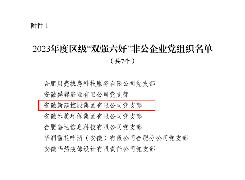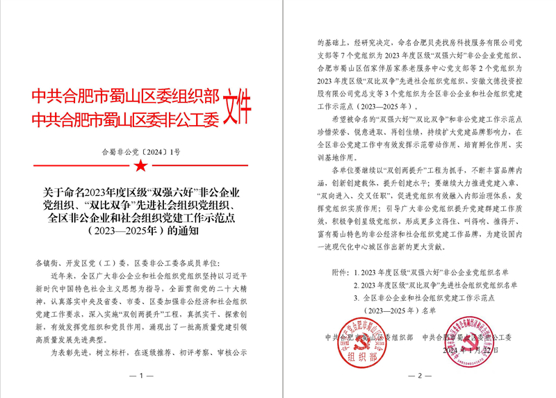 1月22日,中共合肥市蜀山區(qū)委組織部、中共合肥市蜀山區(qū)委非公工委聯(lián)合發(fā)文,命名2023年度區(qū)級“雙強(qiáng)六好”非公企業(yè)黨組織、“雙比雙爭”先進(jìn)社會組織黨組織和全區(qū)非公企業(yè)和社會組織黨建工作示范點,集團(tuán)公司黨支部作為先進(jìn)典型,以及在非公黨建工作中發(fā)揮的示范引領(lǐng)作用,被授予2023年度蜀山區(qū)“雙強(qiáng)六好”非公企業(yè)黨組織榮譽稱號。