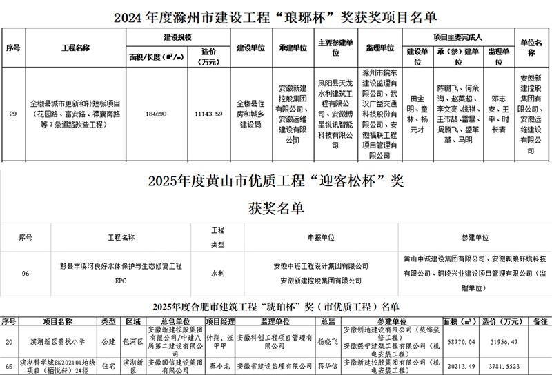 其中榮獲合肥市建筑工程“琥珀杯”獎(jiǎng)的項(xiàng)目是濱湖新區(qū)貴杭小學(xué)、濱湖科學(xué)城BK202101地塊項(xiàng)目2#樓;獲得黃山市優(yōu)質(zhì)工程“迎客松杯”獎(jiǎng)的項(xiàng)目是黟縣豐溪河良好水體保護(hù)與生態(tài)修復(fù)工程EPC;獲得滁州市建設(shè)工程“瑯琊杯”獎(jiǎng)的是全椒縣城市更新和補(bǔ)短板項(xiàng)目((花園路、富安路、襟襄南路等7條道路改造工程)。此外,安徽甲天科技有限公司技術(shù)研發(fā)中心項(xiàng)目工程被評(píng)為合肥市建筑工程優(yōu)質(zhì)結(jié)構(gòu)項(xiàng)目;包河區(qū)吉林路(黃河路-錦繡大道)道路工程被評(píng)為合肥市市政工程安全生產(chǎn)標(biāo)準(zhǔn)化工地。
