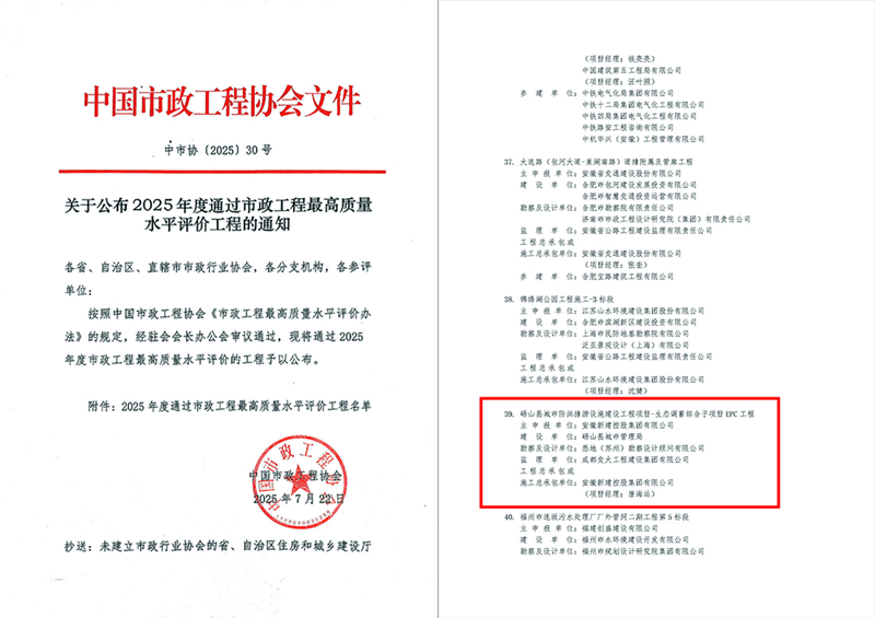 近日,中國市政工程協(xié)會發(fā)布《關(guān)于2025年度通過市政工程最高質(zhì)量水平評價工程的通知》,由集團公司建設(shè)的碭山縣城市防洪排澇設(shè)施建設(shè)工程項目-生態(tài)調(diào)蓄綜合子項目EPC工程成功榮獲“2025年度市政工程最高質(zhì)量水平評價工程”這一市政工程行業(yè)最高榮譽。