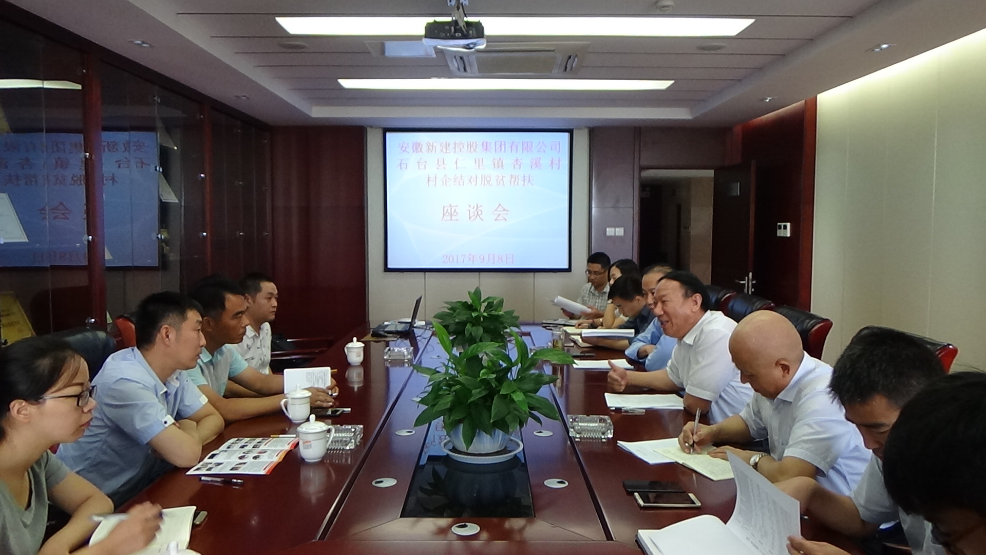2017年9月8日,我公司村企結(jié)對脫貧幫扶對象石臺縣仁里鎮(zhèn)杏溪村的村委書記雷霆一行來我公司座談,安徽新建控股集團有限公司董事長王杰英等相關(guān)領(lǐng)導(dǎo)參加了座談會,雷書記對杏溪村的脫貧情況進(jìn)行了詳細(xì)介紹,公司領(lǐng)導(dǎo)對杏溪村脫貧幫扶給出了初步計劃和方案,村企雙方對座談效果感到滿意。