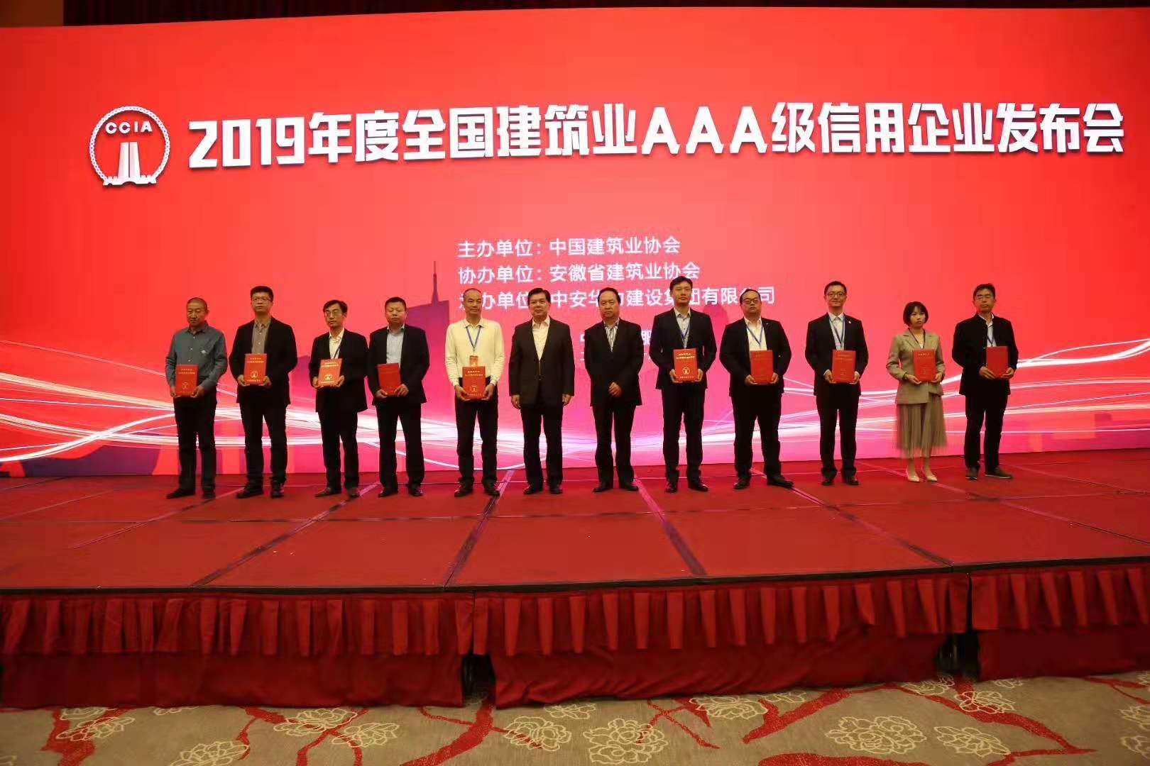 2019年10月31日,由中國建筑業(yè)協(xié)會(huì)主辦、安徽省建筑業(yè)協(xié)會(huì)協(xié)辦的2019年度全國建筑業(yè)AAA級(jí)信用企業(yè)發(fā)布會(huì)在合肥濱湖世紀(jì)金源大飯店圓滿召開,我公司憑借良好的企業(yè)信譽(yù)和優(yōu)質(zhì)的工程質(zhì)量,在諸多施工企業(yè)中脫穎而出,獲評(píng)"全國建筑業(yè)AAA級(jí)信用企業(yè)",并作為AAA級(jí)信用企業(yè)代表上臺(tái)領(lǐng)取證書。