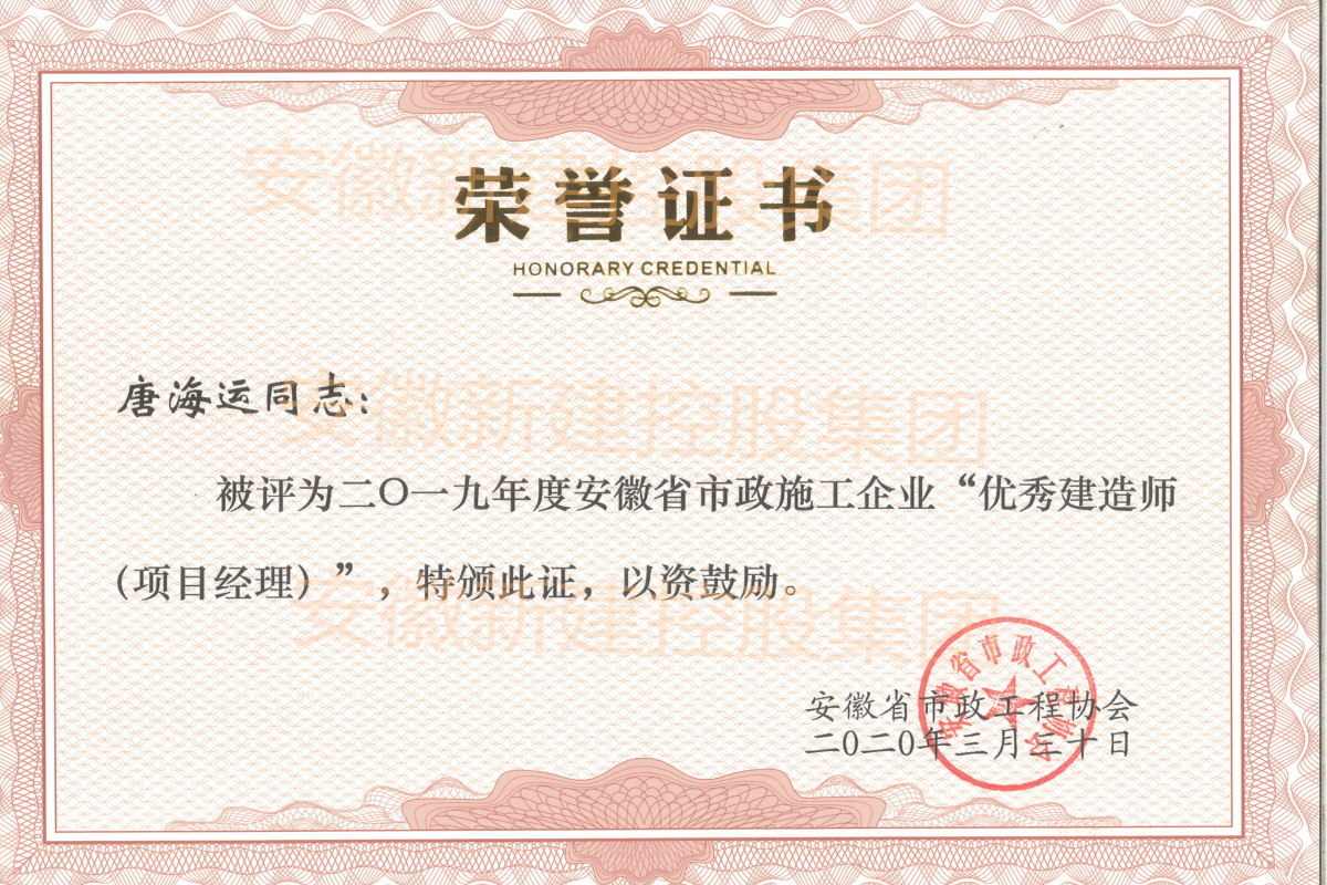 近日,經(jīng)安徽省市政工程協(xié)會組織評審,集團公司副總經(jīng)理劉波、工程管理部張珂、省外市場部唐海運三人,被評為2019年度安徽省市政施工企業(yè)“優(yōu)秀建造師(項目經(jīng)理)”。